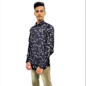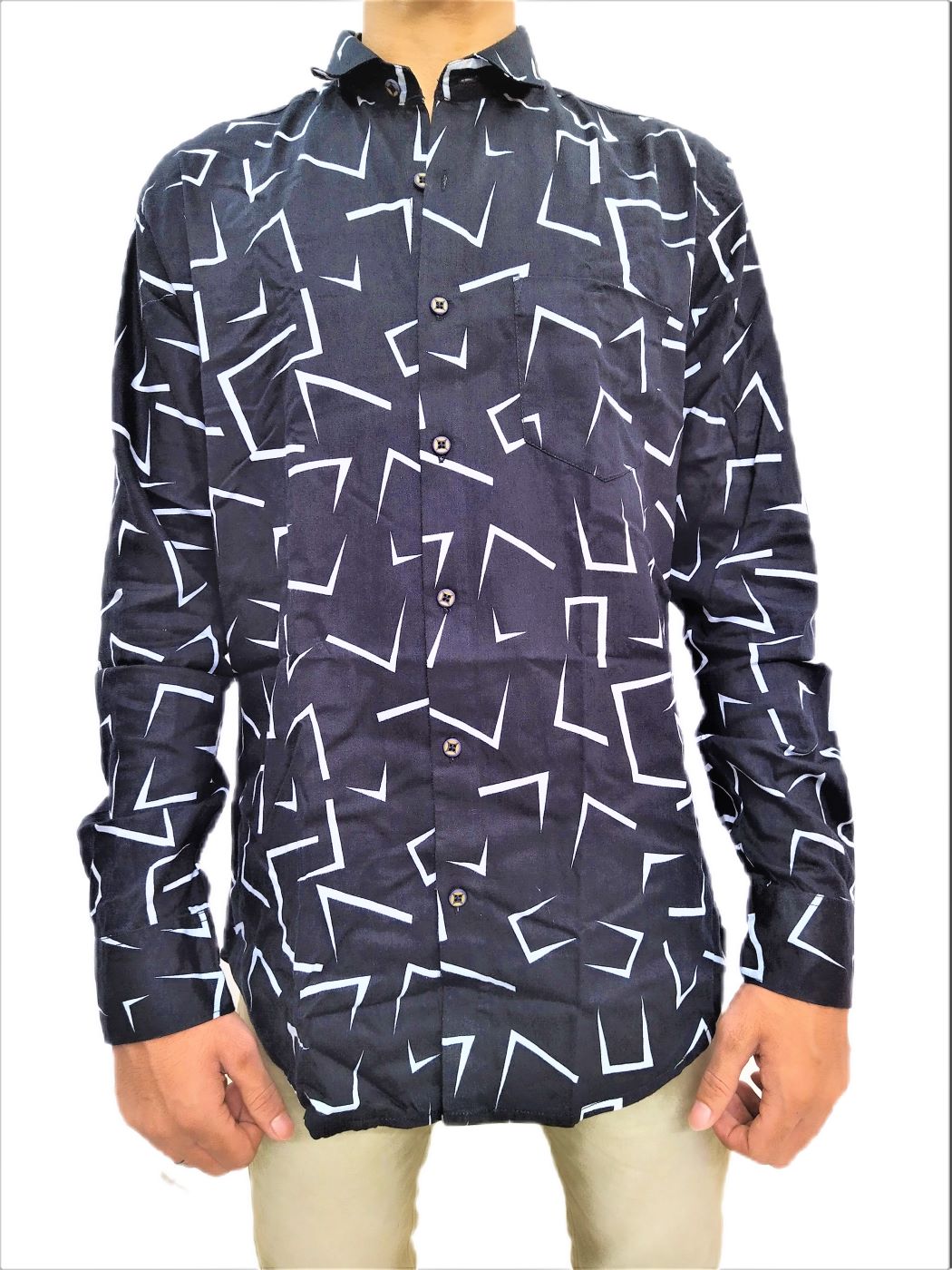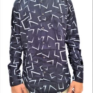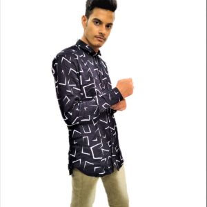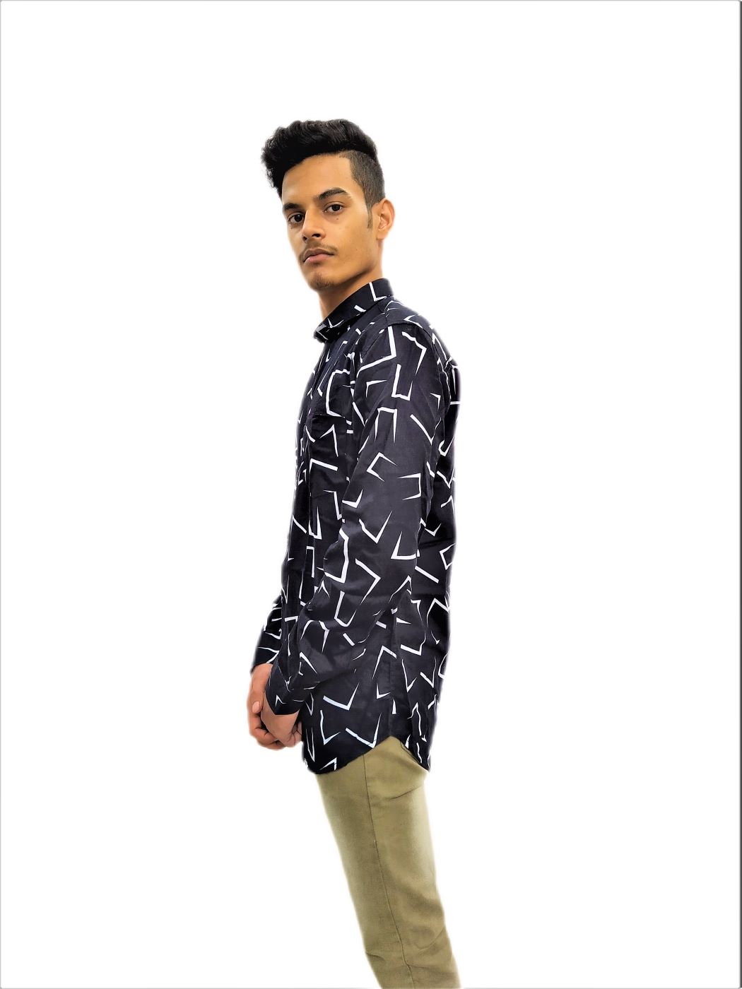 Dark Black With White Zig-Zag Printed Shirt For Men, Has A Normal Collar, Long Sleeves, A Curved Hemline