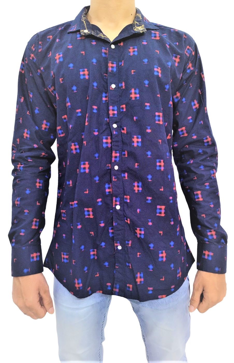 Men’s Navy Blue Printed Soft Denim Casual Shirt, Has A Normal Collar, Long Sleeves, A Curved Hemline